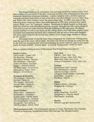 While Two Pound Planet had its moments, both good and bad, at their peak, they put the music first and commercialism last. While a noble tenet, it most likely was their undoing. Still, they stand as a small testament to the the wonderfully innovative and creative music scene that was, is, and will forever be found in Winston-Salem, North Carolina.